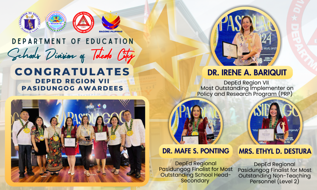 On December 12, 2024, DepEd Region VII hosted the prestigious DepEd Region VII Pasidungog 2024 awarding ceremony at Parklane Hotel, Cebu City. This event celebrated the exceptional contributions of educators and personnel across the region. Among the distinguished awardees from the DepEd Division of Toledo were Dr. Irene A. Bariquit, Dr. Mafe S. Ponting, and Mrs. Ethyl D. Destura.